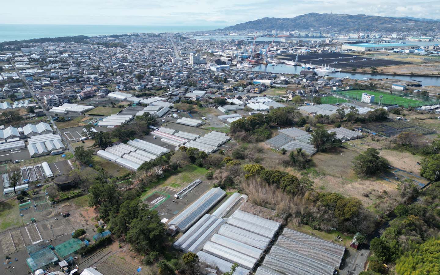 三保半島の多くは砂地のため、トマト・エダマメ・メロン・キュウリなど水捌けの良い土地を好む農作物が盛んに栽培されています。また、砂の地面が太陽の熱を吸収し、保温性が高いため、ビニールハウスや温室などを利用して、通常よりも早く収穫・出荷する「促成栽培」が盛んな地域です。農業ハウスが密集する地域と住宅街が近く、JR清水駅から三保中心部までは約8キロメートルです。